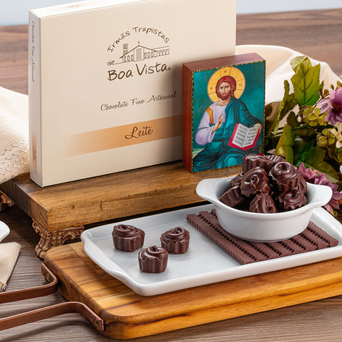 O chocolate artesanal ao leite é feito pelas mãos das monjas trapistas e expressão da vida de oração, apresentando o suave aroma do chocolate ao leite.