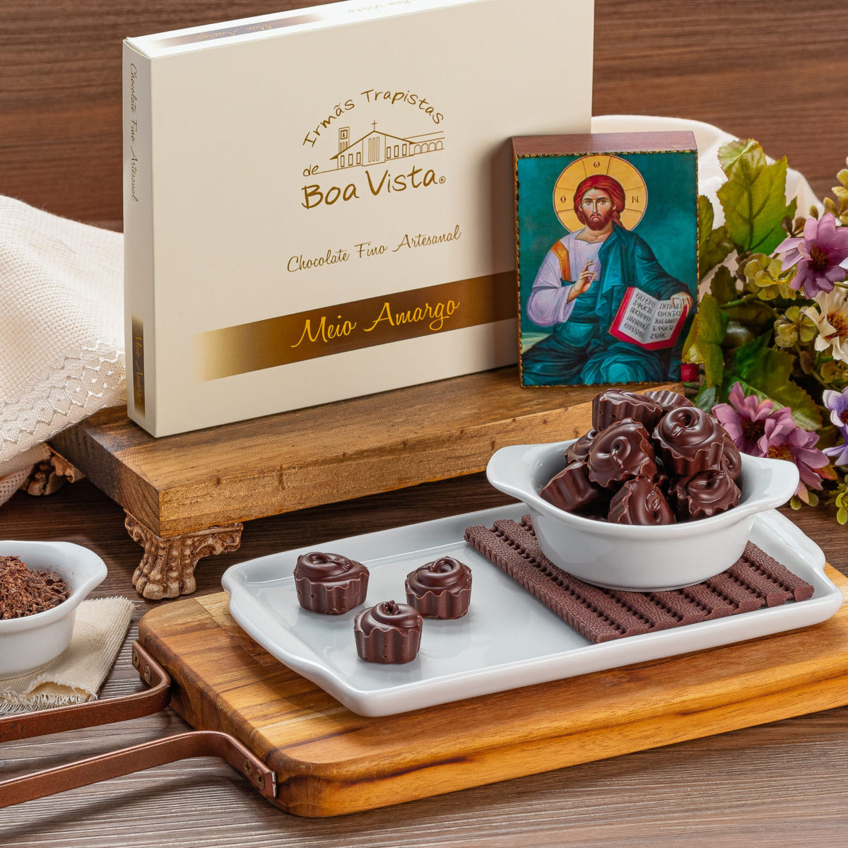 Fruto do trabalho manual das monjas trapistas, o chocolate artesanal Meio Amargo é feito em baixas temperaturas para aproveitar o maior potencial nutricional do cacau, feito em pequenos lotes.