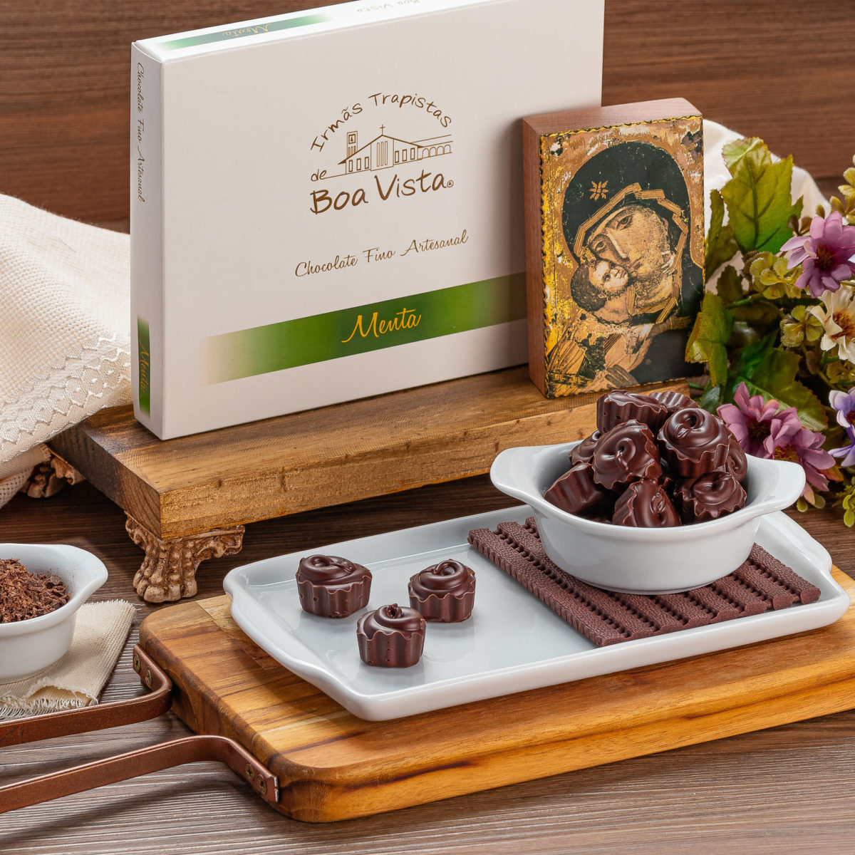 Fruto do trabalho das mãos das monjas trapistas, o chocolate artesanal Menta é produzido em pequenos lotes e essência de menta, apresentando o aroma marcante e único da menta.