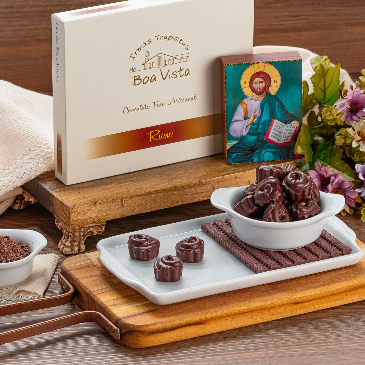 O chocolate artesanal Rum é feito pelas mãos das monjas trapistas e expressão da vida de oração, produzido em pequenos lotes e essência de rum, apresentando um sabor suave e intenso.
